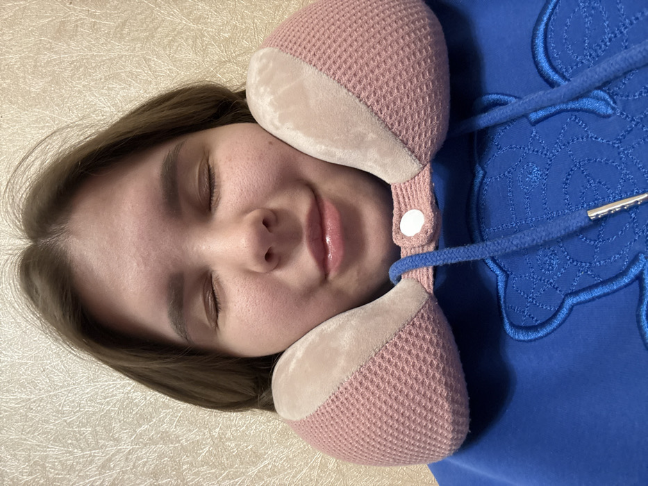 A female subject is depicted in a close-up, chest-up shot, indoors in what is consistent with a residential or private setting within the city of Nizhnekamsk, Russia. The subject has light brown hair and is seen with her eyes closed and a slight, relaxed smile on her lips. She is wearing a travel neck pillow around her neck. The pillow is bicolored, featuring a beige, plush-like material on the top sections and a pink, honeycomb-patterned mesh fabric on the lower, bulkier sections. The pillow is secured at the front by a white snap button, and two blue drawstrings emerge from its base, hanging downwards. The subject wears a blue hooded sweatshirt, or hoodie, which features a large, detailed embroidery of a bear's head in a darker blue thread on the chest area. The background consists of a light-colored, likely beige or off-white, wall with a subtle, textured patterned wallpaper. The lighting is even, suggesting an indoor light source.