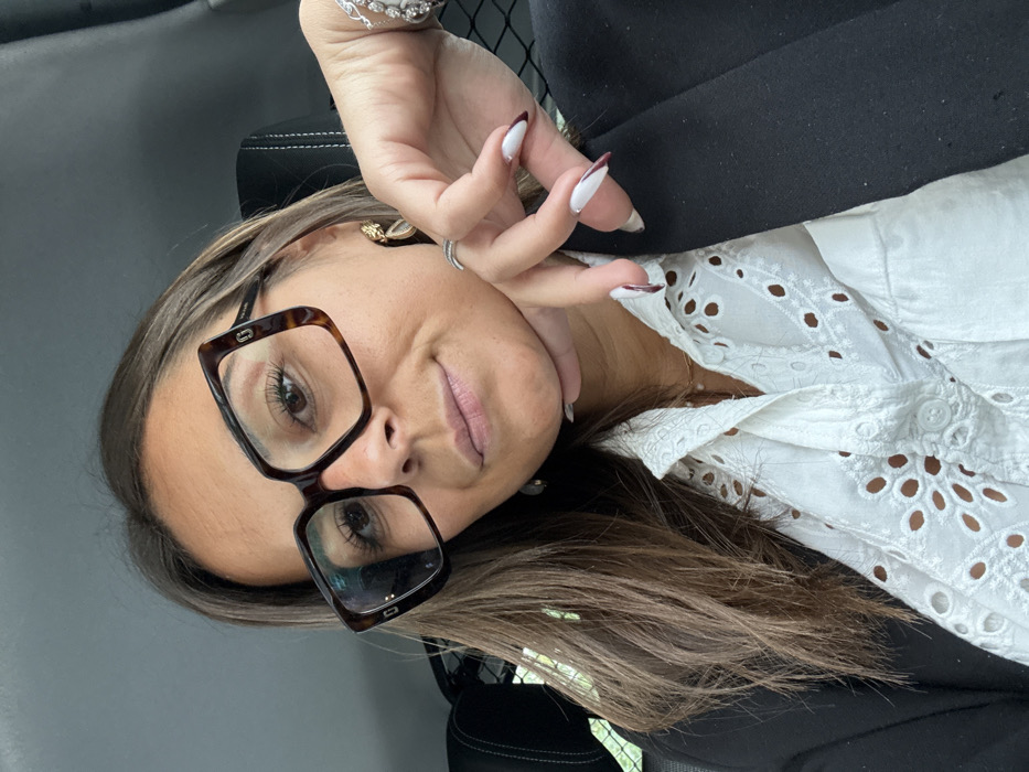 A woman is depicted in a close-up, head-and-shoulders selfie taken inside a vehicle. She has light brown, medium-length hair and is wearing large, square-framed tortoiseshell eyeglasses. Her left hand is positioned with four fingers supporting her chin. Her fingernails are long, almond-shaped, featuring a white tip with a dark red or burgundy accent. She wears a silver-toned ring on her left ring finger and a multi-strand silver-toned bracelet on her left wrist. A gold-toned dangling earring is visible on her right earlobe. She is dressed in a white blouse with eyelet embroidery on the front, beneath a dark-colored blazer. The background consists of a dark gray vehicle interior, including a headrest with white stitching on the left and a dark mesh net on the right. Blurred green foliage is visible through a window on the left. The specific location within Saint-Étienne, France, cannot be determined from the provided image.