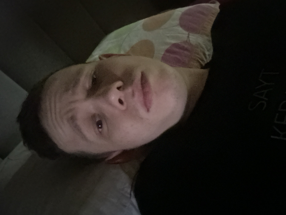 The image depicts a single male individual in an indoor, dimly lit environment, likely a bedroom. The specific location within Tashkent, Uzbekistan, cannot be determined from the visual information provided. The subject is an adult male with light skin and dark hair, positioned supine or reclined with his head resting on a pillow. He is wearing a dark, possibly black, t-shirt with partial light-colored text visible on the chest, reading "SAYT" above "KED". His facial expression is somewhat perplexed or concerned, characterized by slightly furrowed brows and a relaxed mouth. His eyes are open, with some visible redness in the sclera of his right eye (viewer's left). To the subject's left (viewer's right), a pillow with a patterned cover, featuring light green, pink, and orange-brown circular shapes, is visible. The immediate background consists of dark, indistinct elements, consistent with bedding or furniture in a low-light setting. The lighting appears to be localized, possibly from a screen or device taking the photograph. No other individuals or significant objects are discernible.