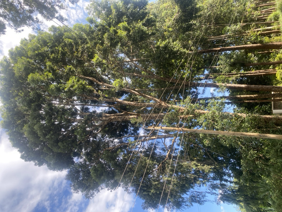 Tall trees dominate the scene, their trunks reaching upward and their leafy canopies meeting to create a dense ceiling. Utility poles are present, with wires stretching between them, cutting across the clear blue sky visible through gaps in the foliage. The sunlight filters through the branches, creating dappled light patterns on the lower vegetation and the forest floor.
