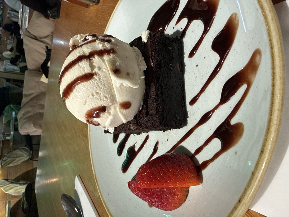- "The image displays a dessert served on a light blue-grey ceramic plate with a brown rim, positioned on a light-colored wooden table within a restaurant setting in Crawley, United Kingdom" by FM-WqBWj1, licensed under CC BY 4.0