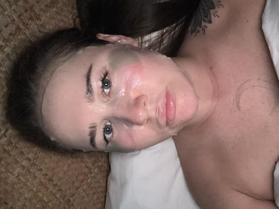 A woman is lying down with a facial mask