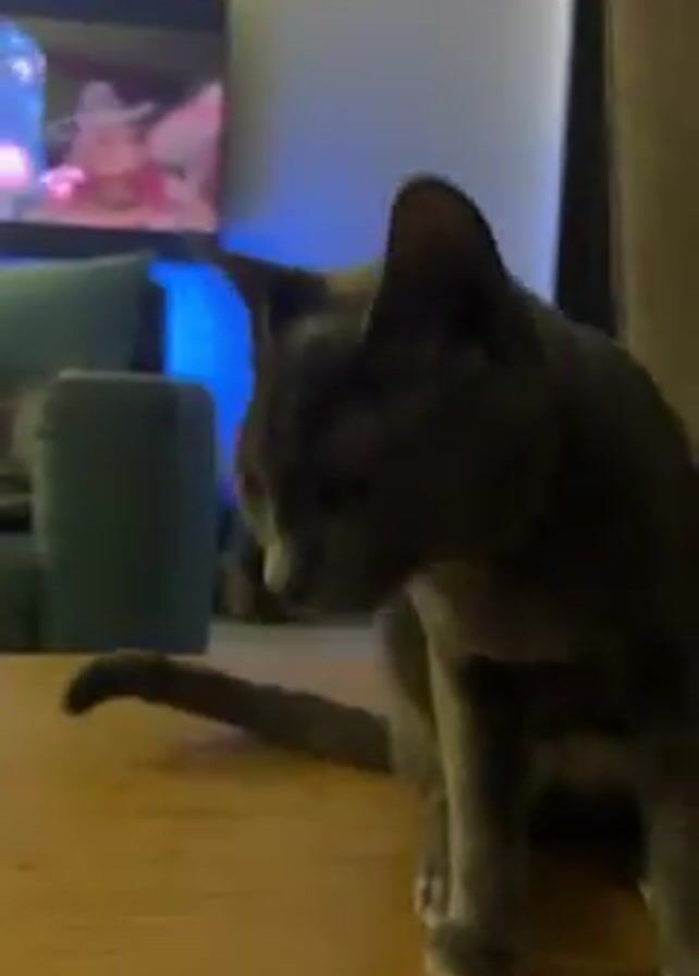 A gray cat sniffs a pack of cigarettes on a wooden coffee table. A teal-colored armchair is behind the table, with a blanket on it. A TV screen on the wall is visible in the background. The camera pans from the coffee table to the armchair. A brown and black tabby cat is now sitting on the armchair. The cat looks towards the left. A white shelving unit is next to the chair.