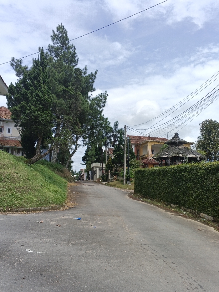 A narrow paved road curves uphill, flanked by green vegetation. A lush grassy slope borders the road on the left, merging into tall evergreen trees that partially obscure a house. On the right, a trimmed hedge lines the road, concealing a traditional gazebo-like structure. Overhead, power lines stretch across a cloudy sky. Further up the road, a small guardhouse marks a gated entrance. Litter is scattered on the pavement.