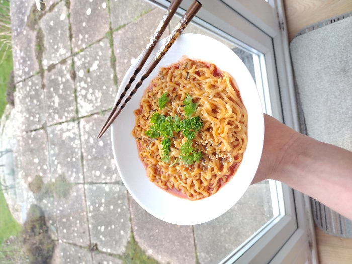 A human hand, consistent with that of an adult, is holding a white, round bowl containing cooked noodles in a reddish-orange broth. The noodles are garnished with green herbs, consistent with parsley, and small white seeds, consistent with sesame seeds. Two dark brown chopsticks, detailed with gold patterns, rest across the rim of the bowl. The immediate foreground shows a section of light wood flooring and a striped floor mat. A white uPVC window frame separates the indoor space from an outdoor patio. The patio is constructed of grey square paving slabs, with green vegetation growing in the crevices and in the blurred background. The scene is located in New Forest, United Kingdom.