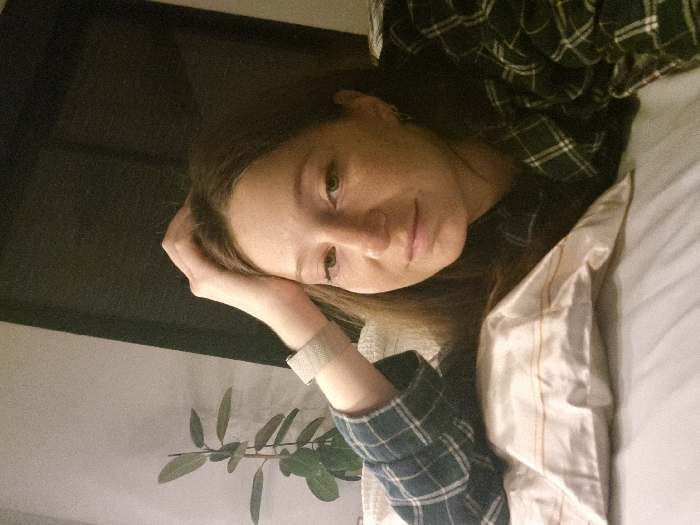 A person lies in bed, resting their head on their hand, and looking toward the viewer. They are wearing a green and blue plaid top. A light-colored pillow with light brown vertical stripes is on the right side of the photo. A window with a black frame is visible in the background. A plant with green leaves is near the window. The person's skin appears fair, and they are wearing a white bracelet.
