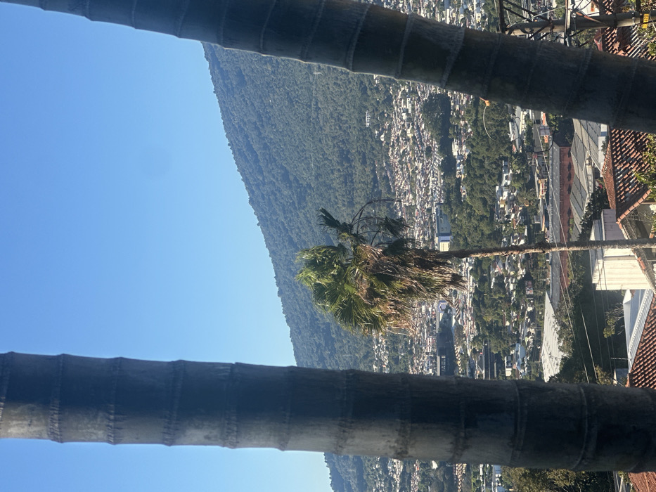 A scene framed by two palm tree trunks offers a partial view of a city nestled against a tree-covered mountain