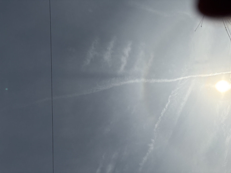 The scene depicts a daytime sky over Oswestry, United Kingdom, viewed from below. The sky is a light blue-grey, with several white condensation trails (contrails) from aircraft. A prominent, relatively straight contrail runs vertically from the upper-middle of the frame downwards towards the lower-middle. Other fainter and more diffused contrails are visible horizontally and diagonally across the mid-left and mid-right portions of the sky. The sun, a bright white-yellow orb, is positioned in the lower-middle of the frame, emitting significant glare. A thin, dark linear object, consistent with an overhead utility wire, spans horizontally across the upper third of the image. In the upper-left quadrant, a small, distinct turquoise circular light spot, indicative of a lens flare artifact, is present. The lower-right corner of the image is partially obscured by a large, dark, out-of-focus reddish-brown object, consistent with a human finger or thumb. To the immediate left of this object, several faint, thin, dark lines or structures, possibly antennas or additional wires, are visible against the sky. No individuals, explicit actions, or direct interactions are discernible within the primary sky view.