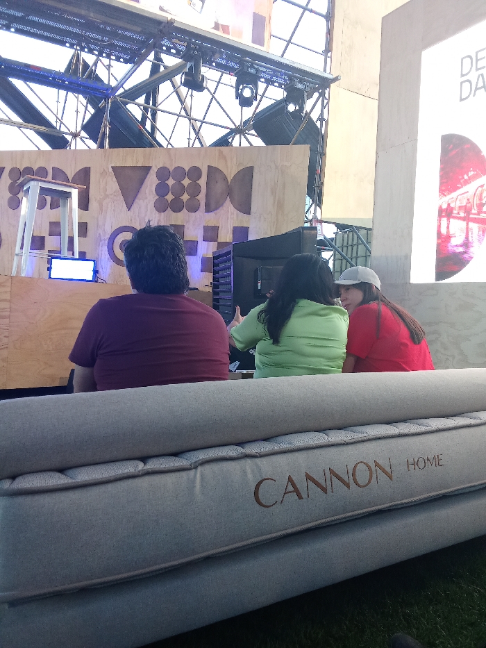 Three individuals are seated in front of a stage. The leftmost person wears a maroon shirt, the person in the middle wears a light green shirt, and the person to the right wears a red shirt and a gray baseball cap. Behind them is a stage with a wooden backdrop featuring geometric shapes. A white stool stands on the left side of the stage. A screen is visible to the right. The foreground is dominated by a gray mattress with the words "CANNON HOME" printed on it.
