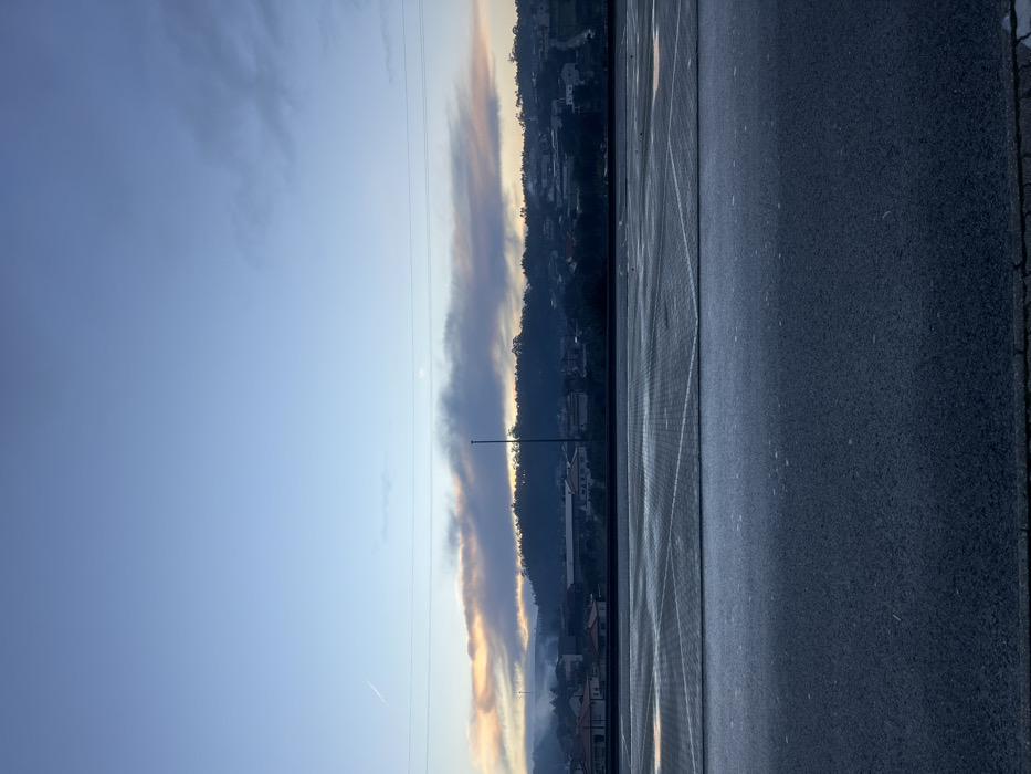 A striking view showcases a blend of natural and built environments. On the left, a blue sky hosts elongated, textured clouds that transition from light to dark tones. A distant line indicates an airplane trail. The skyline features structures nestled against the edge of a dark hillside. The right side features an area covered in dark material, possibly asphalt or a similar paving surface. The scene evokes a quiet, possibly dawn or dusk, atmosphere.