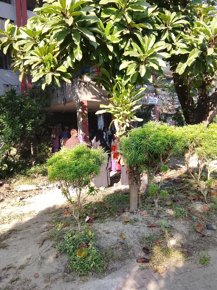 People gather at the entrance of a building, partially obscured by lush green trees and shrubs. The building has red and grey accents. A variety of plants, including small, rounded shrubs, are in the foreground on a dirt patch scattered with leaves. Sunlight shines through the trees, creating shadows on the ground. Some posters are visible on the wall of the building.