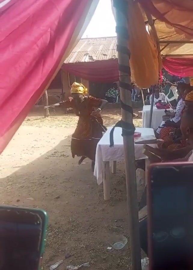woman dancing at an outdoor event. She is wearing a brown patterned dress and a yellow headwrap. She moves her arms and legs to the beat of a drum. The event seems to be taking place under a tent with pink and yellow drapes. There are tables and chairs set up, and other people are sitting and watching. Two people are holding up phones to record the woman's dance. The ground is sandy and there are some leaves scattered around.