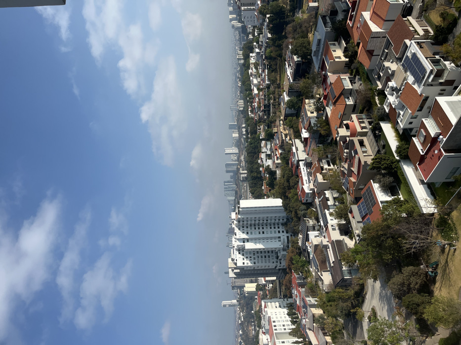 An aerial view showcases a city, blending modern architecture with natural elements. The left side of the frame is dominated by a bright blue sky with scattered clouds. Transitioning rightward, the scene reveals a dense urban landscape with numerous buildings, some featuring red-tiled roofs and solar panels. Lush green trees and vegetation are interspersed among the structures, adding a touch of nature to the cityscape. The image composition presents a clear contrast between the open sky and the built environment.