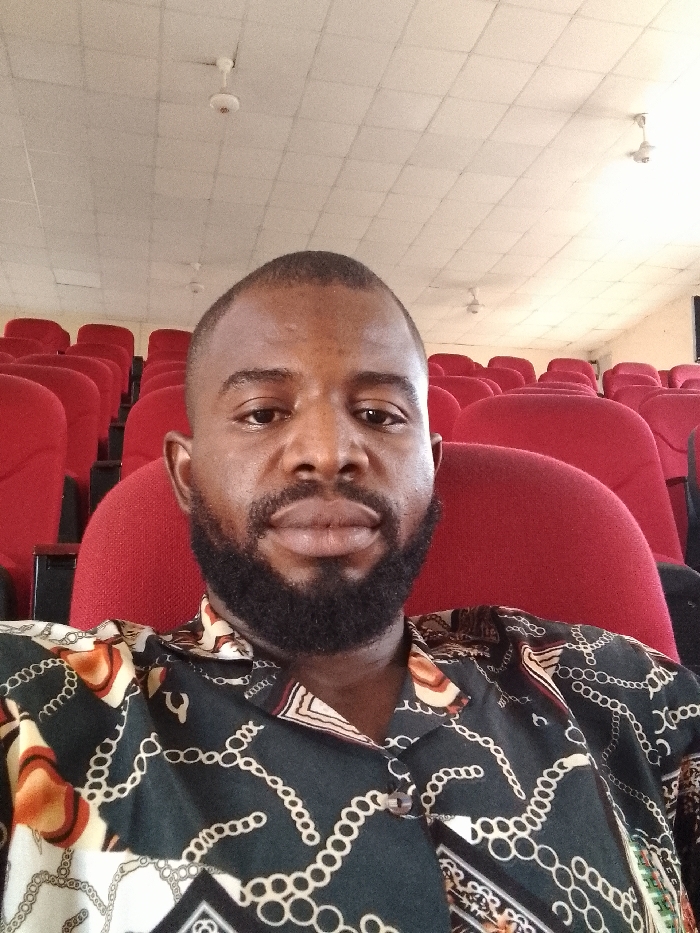 An adult male subject with dark skin, short dark hair, and a dark, trimmed beard and mustache is depicted in a medium shot. He wears a short-sleeved, collared shirt patterned with gold chains and geometric designs on a dark background. The subject is seated in a red upholstered chair, looking directly at the camera with a neutral expression. Behind him, rows of identical, unoccupied red upholstered auditorium seats recede into the background. The environment is an indoor public assembly space, characterized by a light-colored ceiling with visible acoustic tiles and multiple ceiling-mounted light fixtures. This scene is located in a facility within the city of Abobo, Nigeria.