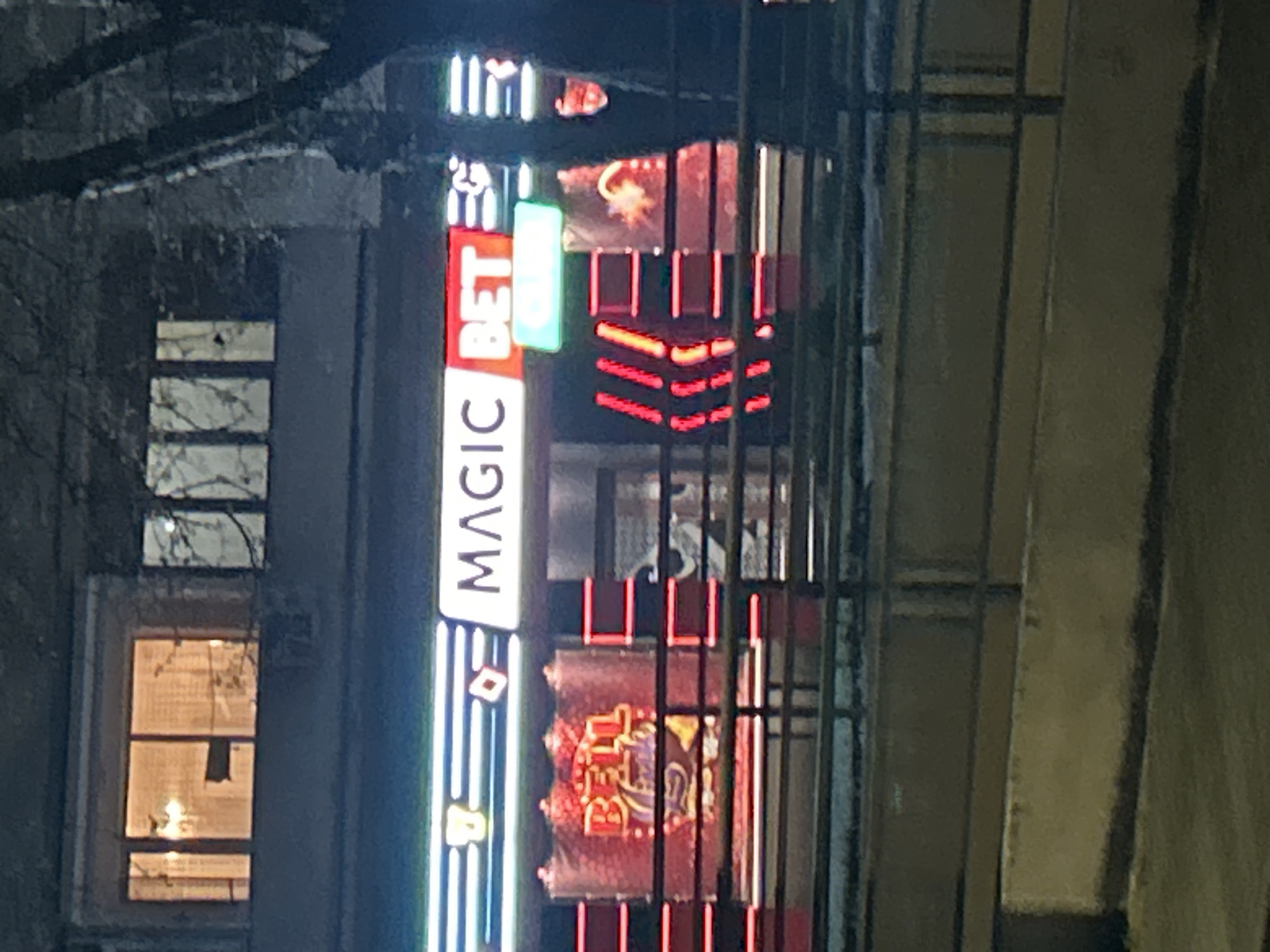 The image depicts the illuminated "MAGIC BET" sign of a betting establishment in Silistra, Bulgaria, at night. The sign is predominantly white with red and green sections, featuring card suit symbols. The establishment displays additional illuminated signage, including a red-lit marquee. A building with lit windows is visible to the left, and vertical architectural elements are present to the right, creating a caged effect. A tree branch is visible in the upper left corner.