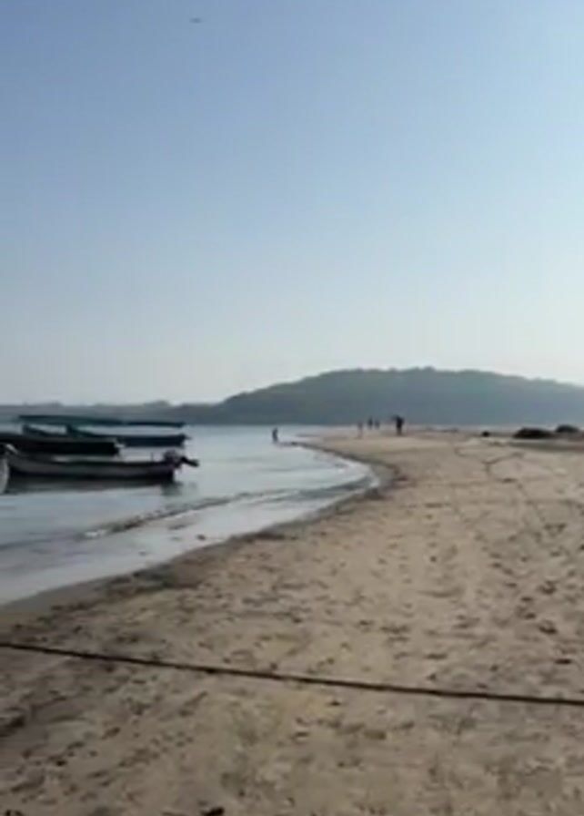 The camera pans across a sandy beach on a sunny day, focusing on several small, wooden boats docked near the shoreline