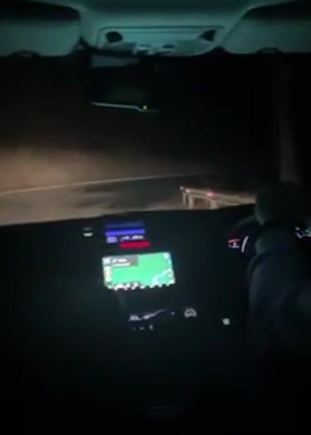 car driving at night on a narrow, winding road. The view is from inside the car, looking out through the windshield. The dashboard is visible, with a navigation screen displaying a map. The driver's hands are on the steering wheel. There is a passenger sitting in the car. The road is illuminated by the car's headlights. It is dark outside, with limited visibility. The car appears to be proceeding cautiously, as if navigating unfamiliar terrain.