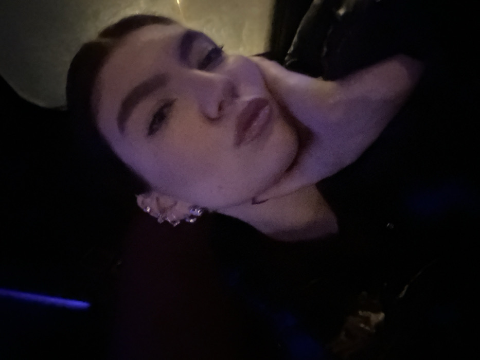 A person with light skin, dark hair, and pink lips rests their face on their left hand. They gaze toward the viewer. A sparkly earring adorns their left ear. The subject wears a dark-colored garment. The background is dark, except for a light source above and a blue line in the lower-left. The image is taken from a low angle.