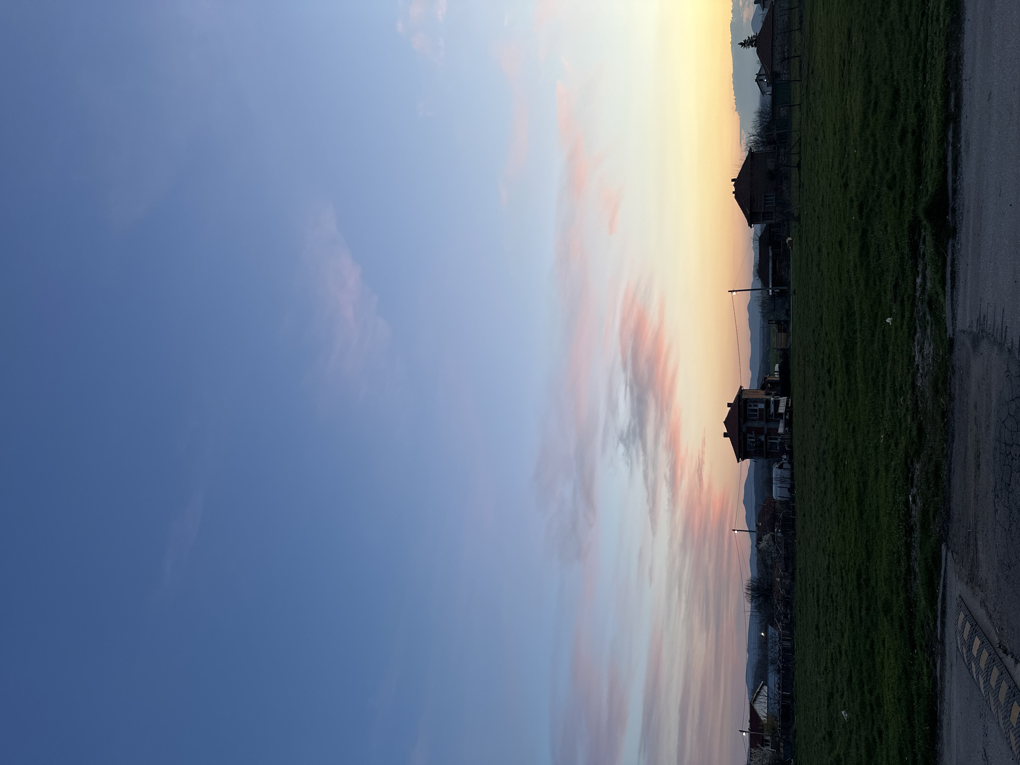 The image depicts a rural or semi-rural scene in Malevo, Bulgaria, at dusk or sunset. The sky transitions from a deep blue overhead to shades of light blue, pink, orange, and pale yellow near the horizon, with scattered clouds displaying these colors. The lower third of the frame consists of a dark asphalt road surface in the immediate foreground, featuring a yellow and black striped speed bump on the left. Beyond the road is a broad expanse of dark green, unmanicured grass. In the mid-ground, several residential structures are visible, largely silhouetted against the lighter sky. A prominent multi-story building with a red-tiled roof and dark walls stands slightly right of center. To its left, other houses with similar red-tiled roofs are present, along with a white utility or commercial van parked near a fence line. A utility pole with an active streetlight is visible between the houses on the left. Distant mountains or hills are silhouetted against the horizon beneath the colorful sky. No individuals or active subjects are discernible within the frame.