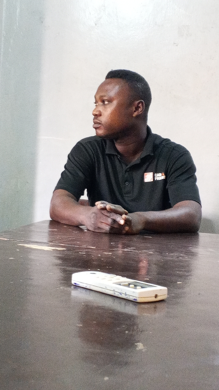An adult male, appearing to be of African descent, is seated at a dark brown wooden table in an indoor setting in Dakata, Nigeria
