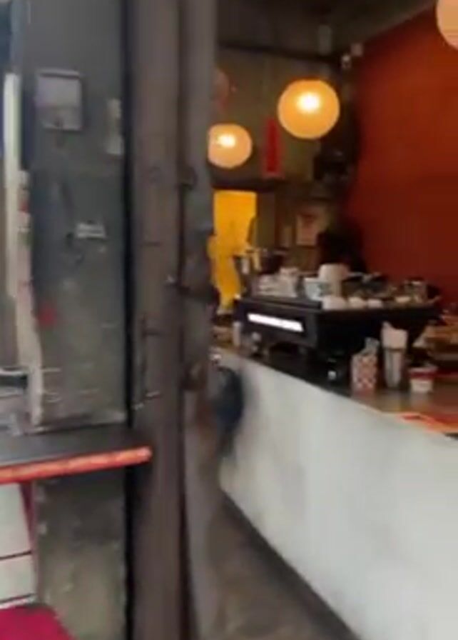 interior of a coffee shop. The camera pans from the outside, where two red stools are placed against a wall with a narrow table, to the interior. Inside, there is a counter with a stainless steel top. Behind the counter, a woman in a hat and gray tank top is looking at a phone. There is an espresso machine, cups, and various drinks and snacks on the counter. The walls are a textured red color, and there are globe-shaped light fixtures hanging from the ceiling. In the corner of the shop is a wooden bench. The overall ambiance appears casual.