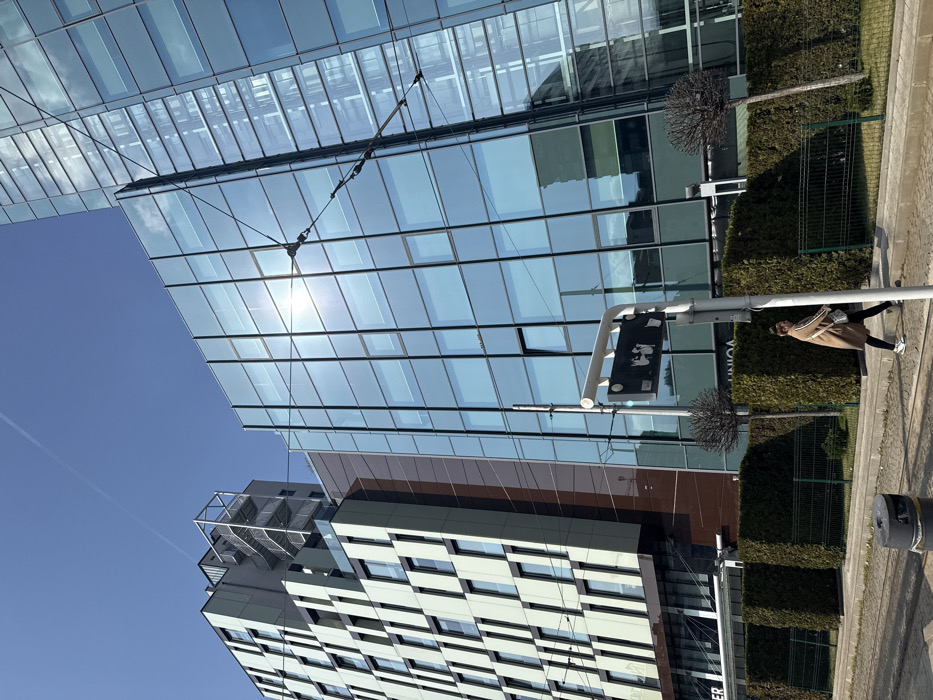 The image displays a modern urban streetscape in Sofia, Bulgaria, specifically near Tsarigradsko Shose Blvd 40. On the left, a multi-story building features a light-toned, geometrically patterned facade with numerous vertical rectangular window elements and an external metal fire escape structure on its upper section. To its right, a prominent glass-facade high-rise reflects intense sunlight, causing a bright glare in the upper-right quadrant, with the "UNICA" corporate name visible on its lower levels. Overhead trolleybus power lines are suspended across the mid-ground, connected by a network of cables. In the foreground, a paved sidewalk runs horizontally, occupied by a single female subject walking from right to left. She is dressed in a long, light brown coat, dark trousers, and white athletic shoes, carrying a light-colored handbag on her right shoulder. A white-framed street sign with an obscured black information panel is mounted on a grey pole near the center of the foreground. A dark green metal fence borders the sidewalk, behind which a meticulously trimmed row of evergreen hedges is maintained. Small, bare topiary trees are spaced along the hedge line. Tram tracks are partially visible on the ground level to the immediate left of the sidewalk. The sky is clear and blue, with a faint white aircraft contrail visible in the upper-left quadrant.