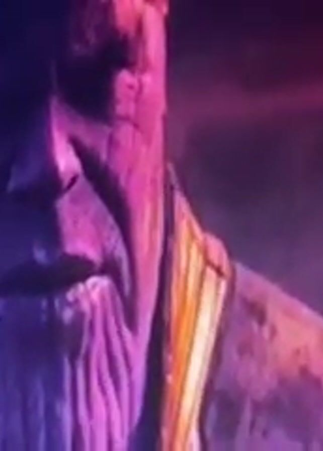 A close up shows Thanos, a purple-skinned alien, wearing gold armor. The background is blurry and indistinct. The video ends in a flash of purple light.