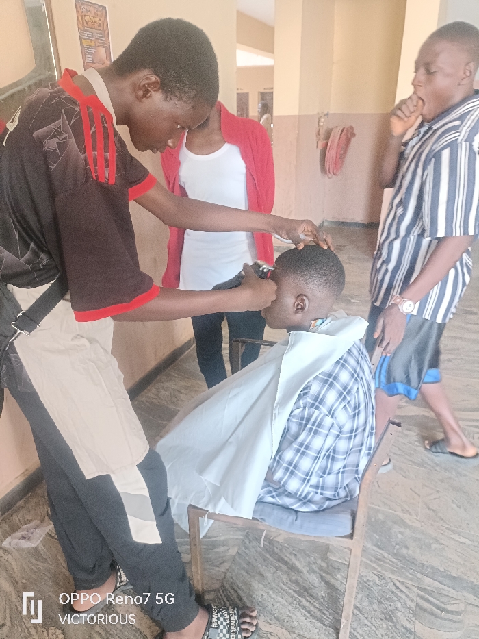 Inside a room, a barber cuts a boy’s hair