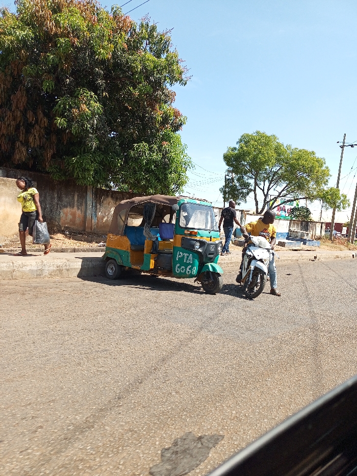 The image displays a daytime street scene in Jos, Nigeria, under a clear blue sky. In the foreground, a paved asphalt road exhibits minor wear, with the dark frame of a vehicle partially visible at the bottom right, indicating the viewpoint. Mid-ground, a green and yellow three-wheeled motorized tricycle, commonly known as a Keke Napep, is stationary. It is positioned with its left wheels on the asphalt and its right wheels on the dirt shoulder. The side of the vehicle prominently displays the inscription "PTA 6068." Its passenger-side door is open. To the left of the tricycle, a woman walks on the dirt shoulder. She wears a yellow short-sleeved top, dark shorts, and open-toed sandals, carrying a black plastic bag in her left hand. To the right of the tricycle, a male individual, dressed in a yellow t-shirt and blue jeans, stands alongside a white motorcycle, holding its handlebars. Behind the tricycle and the motorcycle, further along the dirt shoulder, another male individual wearing a dark t-shirt and jeans is visible, walking. The background on the left is dominated by a large, dense-leafed tree, showing a mix of green and reddish foliage, behind which runs a weathered concrete wall. On the right side of the background, several more trees are present, along with multiple utility poles and overhead power lines, extending into the distance where faint outlines of structures are visible.