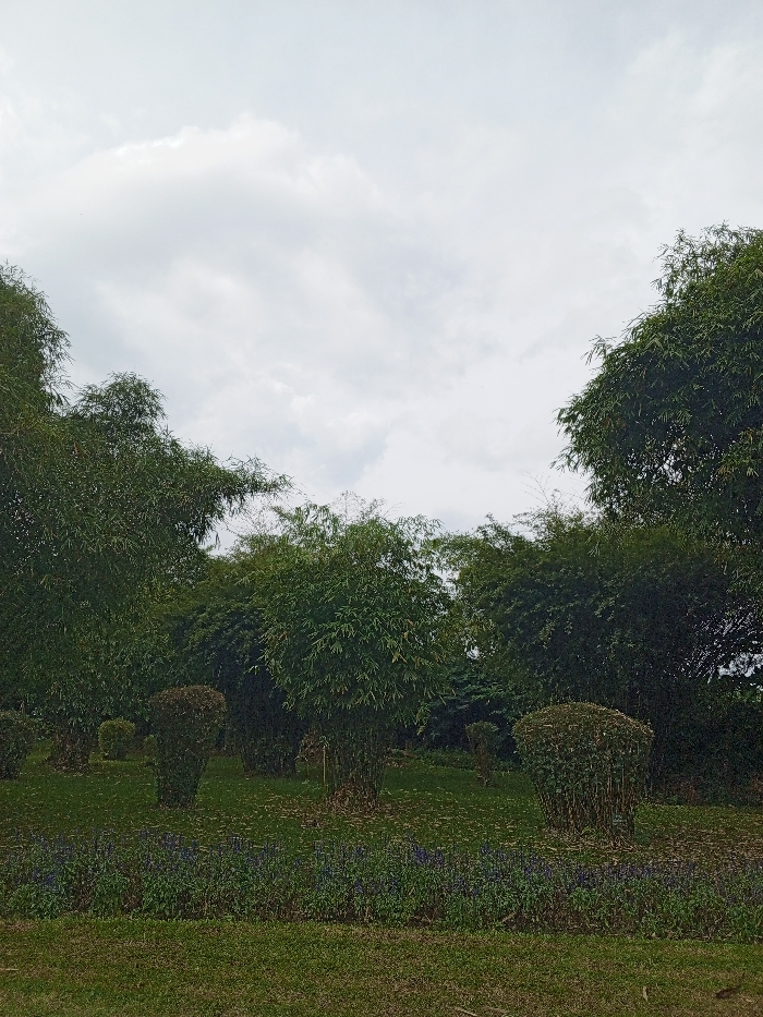 A tranquil outdoor scene features lush green trees and manicured shrubbery under an overcast sky. The foliage creates a dense backdrop, while the trimmed bushes add a touch of formality to the landscape. In the foreground, a patch of purple flowers provides a pop of color, contrasting with the predominantly green palette. The overall impression is one of serene natural beauty.
