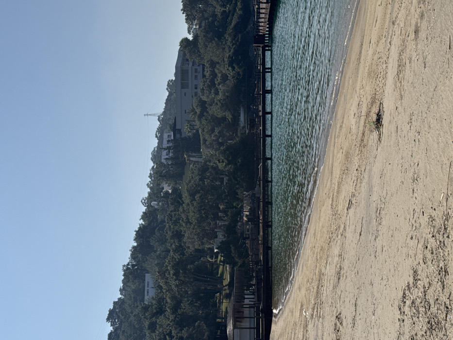 The image depicts a tranquil coastal scene in Bodrum, Turkey, under a clear, bright sky. In the foreground, a sandy beach with tan-colored sand stretches across the bottom left, meeting calm, clear turquoise-green water that fills the midground. Small ripples are visible on the water's surface as it gently laps the shore. No individuals are present on the beach or in the water. Extending from the left side of the frame and curving along the shoreline is a dark wooden pier, supported by vertical posts. A small, open-sided structure with a light-colored, possibly thatched roof stands at the pier's origin on the far left. The pier then extends further into the water towards the right. The background is dominated by densely vegetated hills covered with numerous green trees. Several white or light-colored buildings, consistent with residential or resort architecture, are nestled amongst the foliage and perched on the hillsides. A tall metal transmission tower is visible on a distant hilltop on the upper right side of the frame. The overall lighting suggests strong sunlight.
