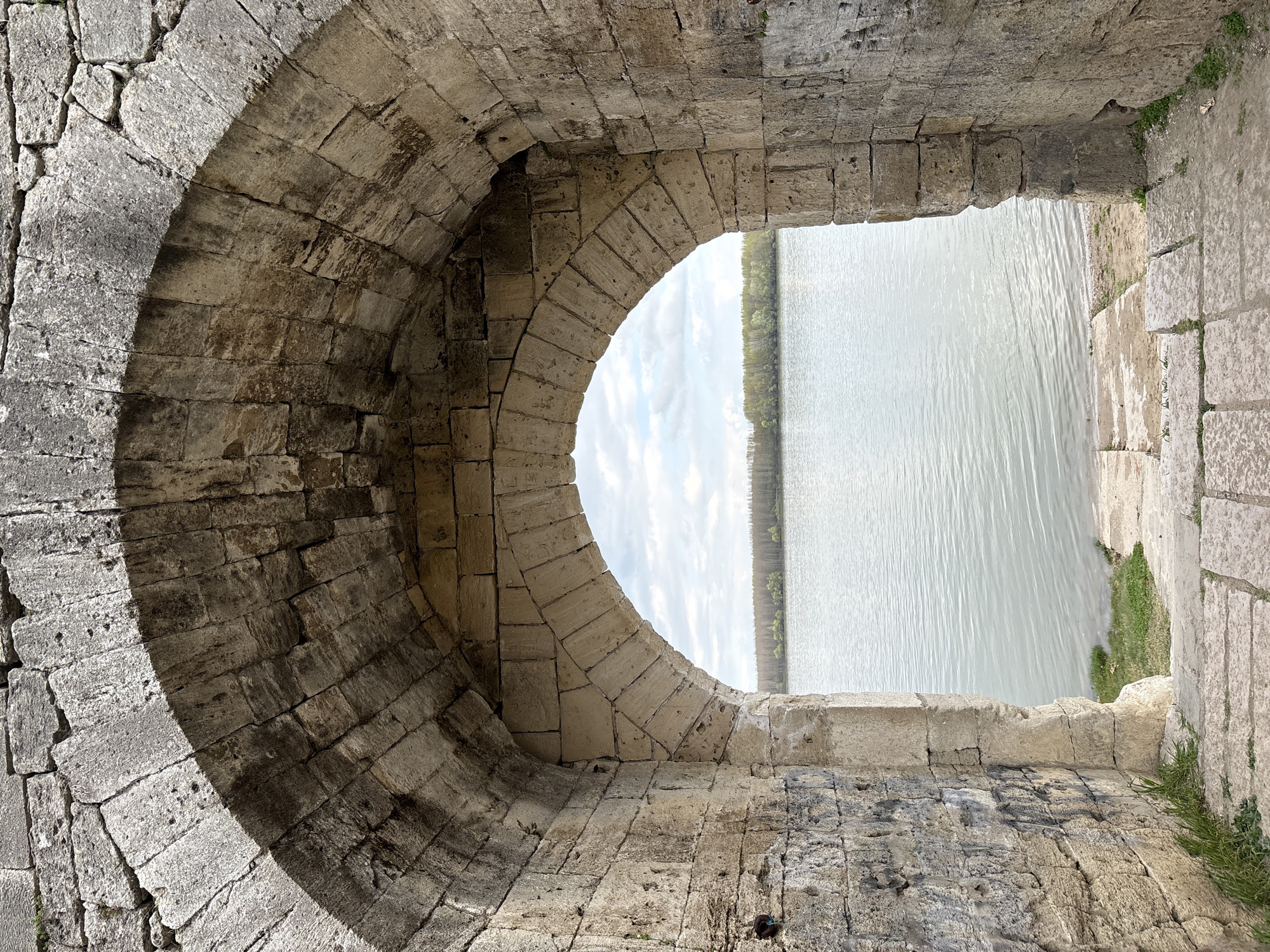 view through a stone archway and a rectangular opening, likely part of a historical structure in Vidin, Bulgaria