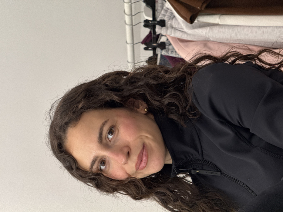 The image displays a medium close-up portrait of a single female individual in an indoor setting. The subject, an adult, possesses long, dark brown, curly hair and brown eyes, looking directly at the viewer. Her skin tone is light, exhibiting a pinkish hue on her cheeks. She wears a black, high-collared, long-sleeved top with a partial front zipper; a brand logo is partially discernible on the zipper pull tab. A small, spherical, golden stud earring is visible in her right ear. She has a subtle, closed-mouth smile. The background consists of a plain, light-colored wall, likely white or off-white, occupying the upper and left sections of the frame. To the right of the subject, a silver-toned metal clothing rack is partially visible, holding various garments on hangers. Observable items on the rack include a light grey garment with a white drawstring, a pink garment, and a brown garment, along with other less distinct articles of clothing. The environment is an interior space, likely a room. No specific landmarks, signs, or unique architectural features are present to identify the precise location within the city of Palma de Mallorca, Spain, or any other geographical area.