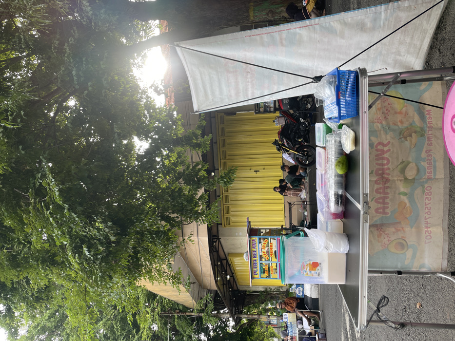 A street scene shows a food stall under a white canopy beside a yellow building. The stall table holds containers, drinks, and a blue basket. People sit near motorcycles in front of the yellow building. A large leafy tree is visible on the left. A sign for "ES TELER" is attached to the stall. A street stretches along the right side of the stall.