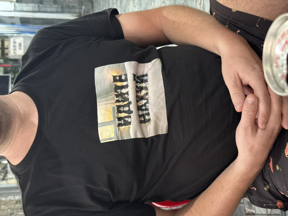 An unidentified individual, likely an adult male, is seated in a commercial establishment within Nha Trang, Vietnam. The person wears a black, short-sleeved, crew-neck t-shirt. A rectangular graphic on the t-shirt's chest depicts two horizontal rows of black-and-white kittens (tuxedo cats) on white window sills. Between the upper row of five kittens and the lower row of four kittens, the black Cyrillic text "ИДИТЕ" is visible. Below the lower row of kittens, the black Cyrillic text "НАШИ" is displayed. The individual's forearms and hands are clasped and resting over the abdomen. Dark-colored shorts featuring a repeating pattern of light pink flamingos and small golf clubs are worn on the lower body. A silver metal beverage can, open with a red interior, is partially visible in the lower right foreground. The background is blurred, showing light-colored tiled flooring and indistinct architectural elements, including a red chair back on the left.