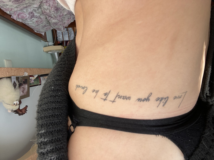 The image depicts the left torso of an individual, likely female, situated indoors within the city of Parvomaitsi, Bulgaria. The subject displays a fair skin tone with a tattoo on the rib cage area that reads "Love like you want to be loved" in a cursive font. A portion of a black lace bralette is visible at the top, along with a dark gray, coarse-knit long-sleeved garment covering the upper left arm and shoulder. The background reveals an interior room with light blue walls. A wooden shelf, possibly with a decorative finish, is mounted on the wall to the right. On this shelf are various objects, including a brown horse figurine, a white fluffy llama or alpaca figurine wearing glasses, and several framed pictures, one prominently featuring multiple individuals. Below the shelf and to the right, a wooden bed frame is visible, with pillows and a comforter displaying a floral pattern primarily in pink and purple hues against a light background. A small, beige-colored appliance, possibly a fan or heater, is partially visible near the bed. Bright, indirect light illuminates the scene.