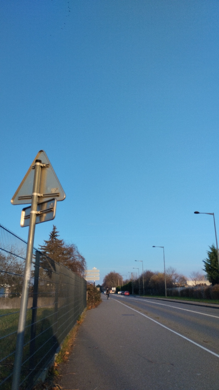 The scene depicts a daytime exterior view along a roadway in Hoenheim, France, under a clear, bright blue sky. In the immediate foreground, to the left, is a galvanized metal pole supporting the backside of two road signs; the upper sign is triangular, and the lower is rectangular. Adjacent to the pole, a dark green chain-link fence runs horizontally, extending into the midground. A long, distinct shadow, originating from an unseen source to the left, falls across the fence and a portion of the adjacent asphalt pathway. The midground features an asphalt pathway, lightly soiled with scattered dark debris or leaves, running parallel to the fence and leading into the distance. To the right of the pathway is an asphalt road, marked with a solid white line on its right edge, indicating a single lane visible from this perspective. Several modern streetlights with dark, curved fixtures line the right side of the road, receding into the background. Distant traffic includes a lone cyclist on the pathway, moving away from the viewer, and multiple cars on the road, also receding. One vehicle appears red. The environment along the fence and road consists of various trees and bushes, some exhibiting late autumn foliage, others bare. The background is dominated by a vast, cloudless blue sky, with a subtle group of small, dark specks visible in the upper-left quadrant, possibly birds. The light indicates a low sun angle, casting elongated shadows.