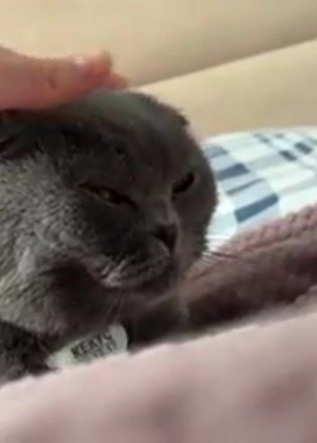 A person's hand gently pets a gray Scottish Fold cat lying on a pink textured blanket