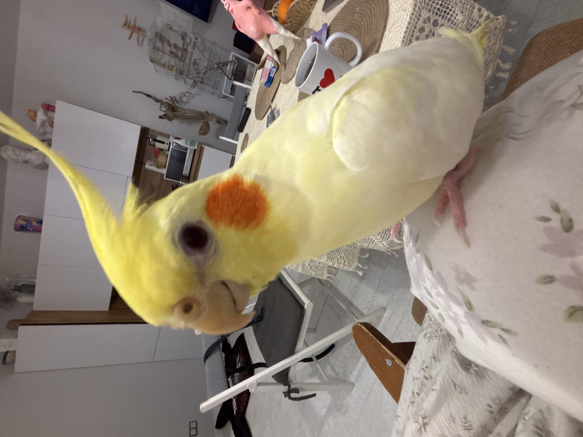 - "A light-yellow cockatiel with orange cheek patches is perched on a surface covered with a white floral patterned cloth" by FM-O5Jum1, licensed under CC BY 4.0