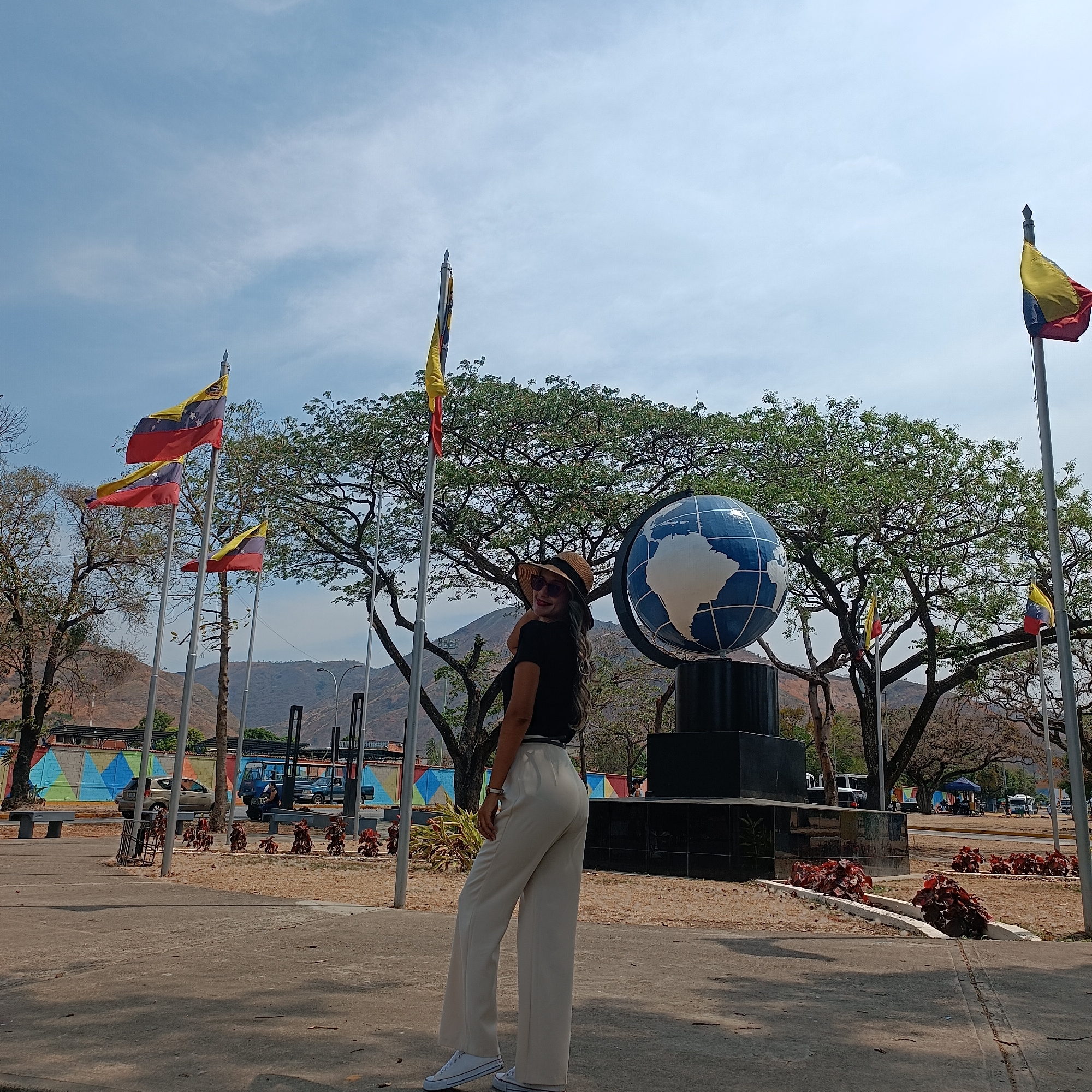 The image displays an outdoor public space in La Victoria, Venezuela, characterized by a clear sky with scattered clouds. A female individual is positioned left-of-center in the foreground, facing right and looking back towards the camera over her left shoulder. She wears a straw hat, red-lensed sunglasses, a black short-sleeved top, and light-colored wide-leg pants with white sneakers. Her long, wavy hair is visible below the hat. To her right, a prominent monument features a large blue and white globe sculpture, depicting continents including South America, mounted on a dark, multi-tiered rectangular pedestal. Multiple Venezuelan flags (yellow, blue, red with stars) are displayed on tall flagpoles throughout the scene, exhibiting slight movement from wind. The background includes numerous large trees with green foliage, and a range of arid, reddish-brown mountains under a hazy blue sky. The ground comprises paved areas and dry, sparsely vegetated earth with rows of reddish-leafed plants near the monument's base. In the distant background, a colorful geometric mural is visible on a wall, alongside several vehicles, including a light-colored sedan and a blue utility truck, indicating a road or parking area. Concrete benches and dark, rectangular structural elements are also present.