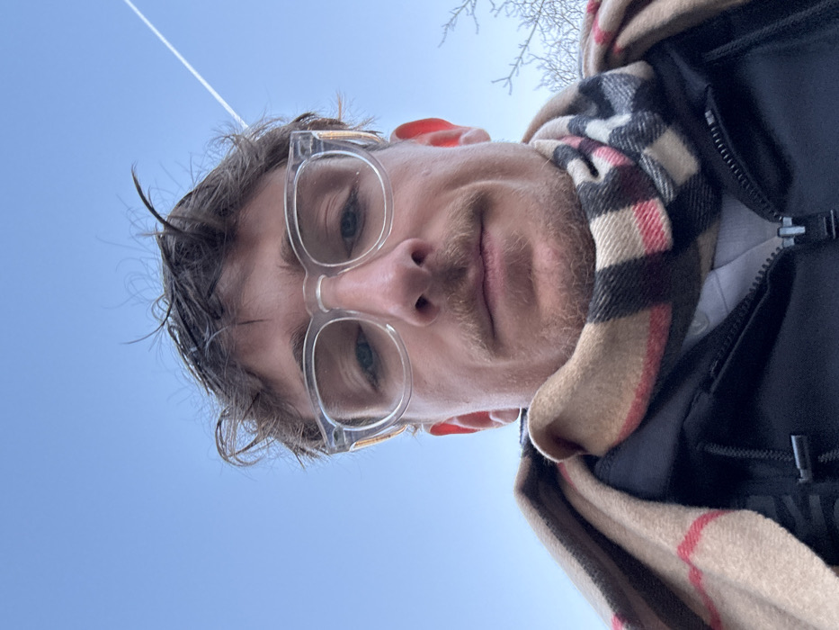 A selfie from a low angle features a fair-skinned individual with wet, tousled brown hair. They are wearing clear-framed glasses and a plaid scarf wrapped around their neck. The sky is visible in the background. A faint contrail stretches across the blue expanse. A jacket is visible beneath the scarf.