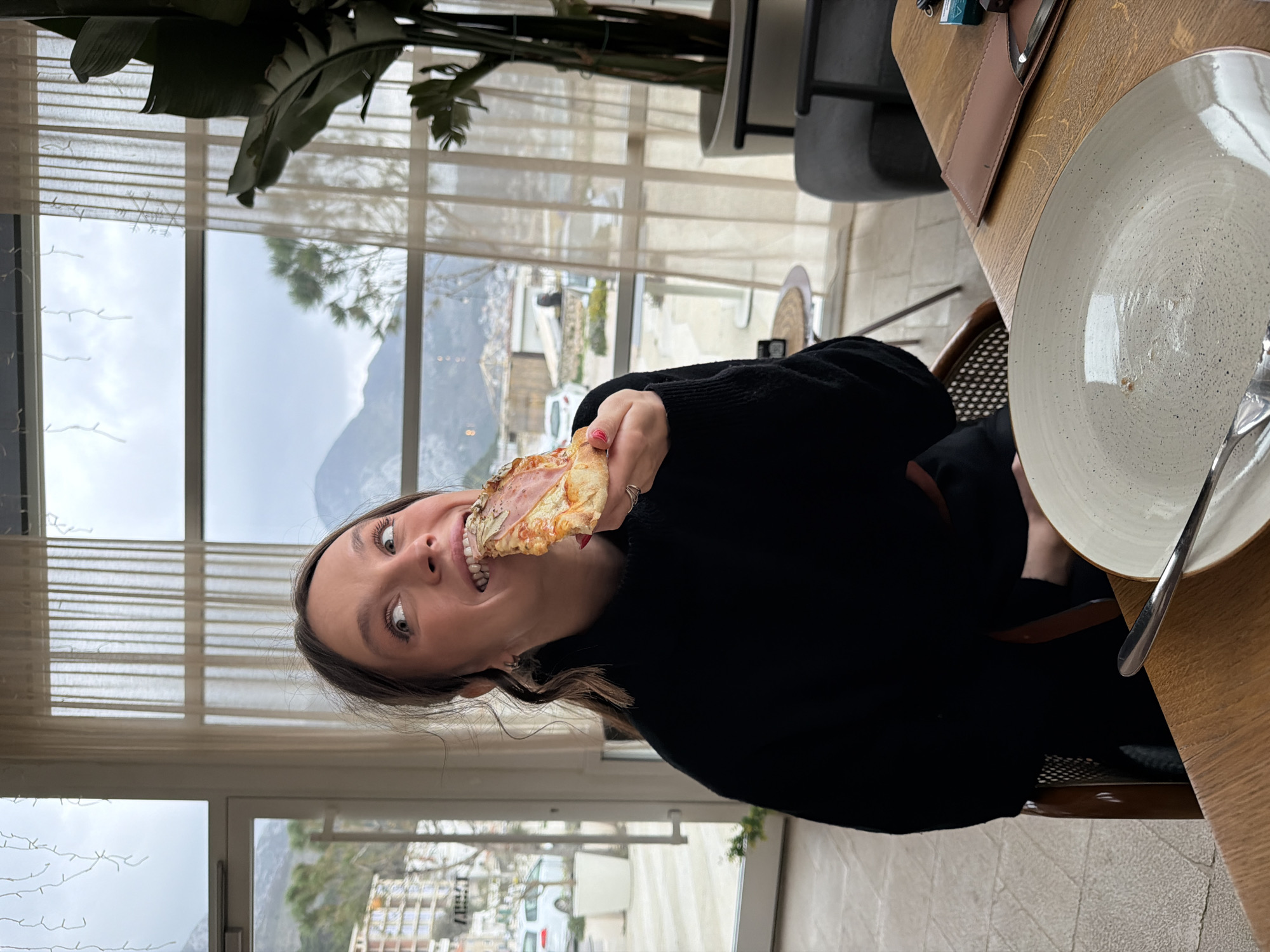 An indoor scene depicts a woman in a restaurant or cafe setting in Sutomore, Montenegro, actively eating a slice of pizza. The woman, positioned in the left half of the frame, has long, dark brown hair and wears a black high-necked top. She holds a pizza slice topped with ham, cheese, and sauce to her mouth with her right hand, her fingernails painted red, and a ring visible on her ring finger. Her eyes are wide, gazing upwards and to the right, with her mouth open as she bites into the pizza, conveying an animated expression. The woman is seated at a wooden table with visible grain, where a speckled, light-colored ceramic plate containing a fork and minimal food residue rests in the foreground. A brown leather wallet or folder with a pen is also on the table. She sits in a chair with a wicker-style back, partially visible. The background features large windows with white frames, offering a view of the external environment. Sheer, light-colored curtains hang over some window sections. Outside, a mountainous landscape is visible under a cloudy sky. To the left, a multi-story building, possibly under construction or renovation, is partially seen, along with a white car and paved areas. To the right, further urban elements, including other buildings, vehicles, and sparse trees, are visible, characteristic of a coastal town. Inside, near the top of the windows, decorative string lights are strung. A large, potted green plant in a white planter is positioned to the right of the window view.