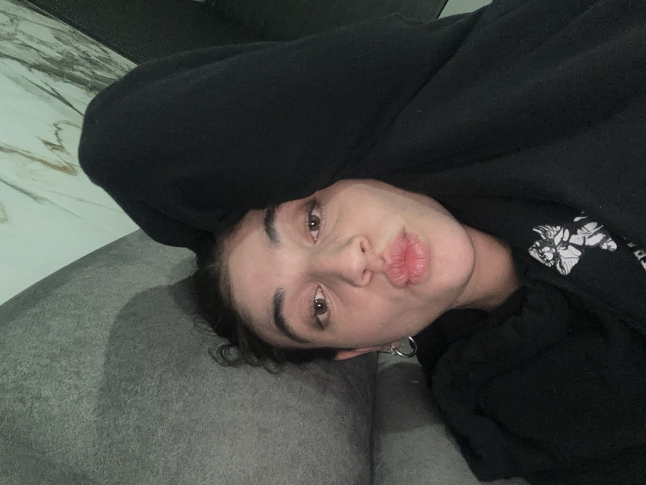 A person with brown eyes and pouty lips reclines on a grey couch. They're partially covered by a dark hoodie, with a visible print of an angel on the right side of their chest. Part of their hair is visible. A silver earring dangles from their left ear. The background features a textured wall, potentially marble.