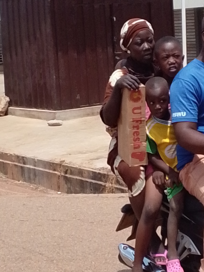 This image depicts a daylight outdoor scene in Sabaa, Ghana, featuring four individuals on a motorcycle. A woman, wearing a brown and white patterned headwrap and garment, is centrally positioned, holding a vertical light brown cardboard box labeled "U Fresh" with red fruit graphics. Two children are also on the motorcycle with her. A young child, dressed in a yellow and green patterned shirt and green shorts, sits in front of the woman, wearing pink Crocs-style sandals, and looks towards the viewer. Another child's face is visible behind the woman's right shoulder, also looking forward. On the far right, the torso and arm of an adult wearing a blue t-shirt with "SWU" visible and light-colored trousers are partially visible, indicating the motorcycle operator. The background includes a dark brown corrugated structure with a concrete base on the left, and a lighter-colored building section on the right. A two-tiered concrete curb separates a light-colored paved area from an unpaved road surface in the foreground.