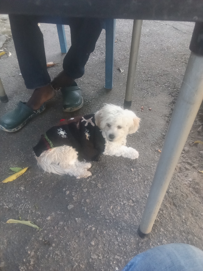 - "A small, white dog wearing a black sweater with white snowflakes rests on the gray asphalt" by FM-Fx4qR2, licensed under CC BY 4.0