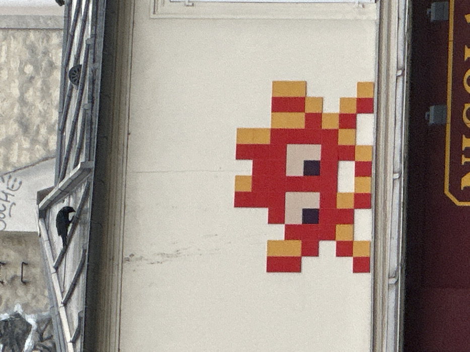 An off-centered close-up shows pixel art of a red and yellow alien figure on a white wall
