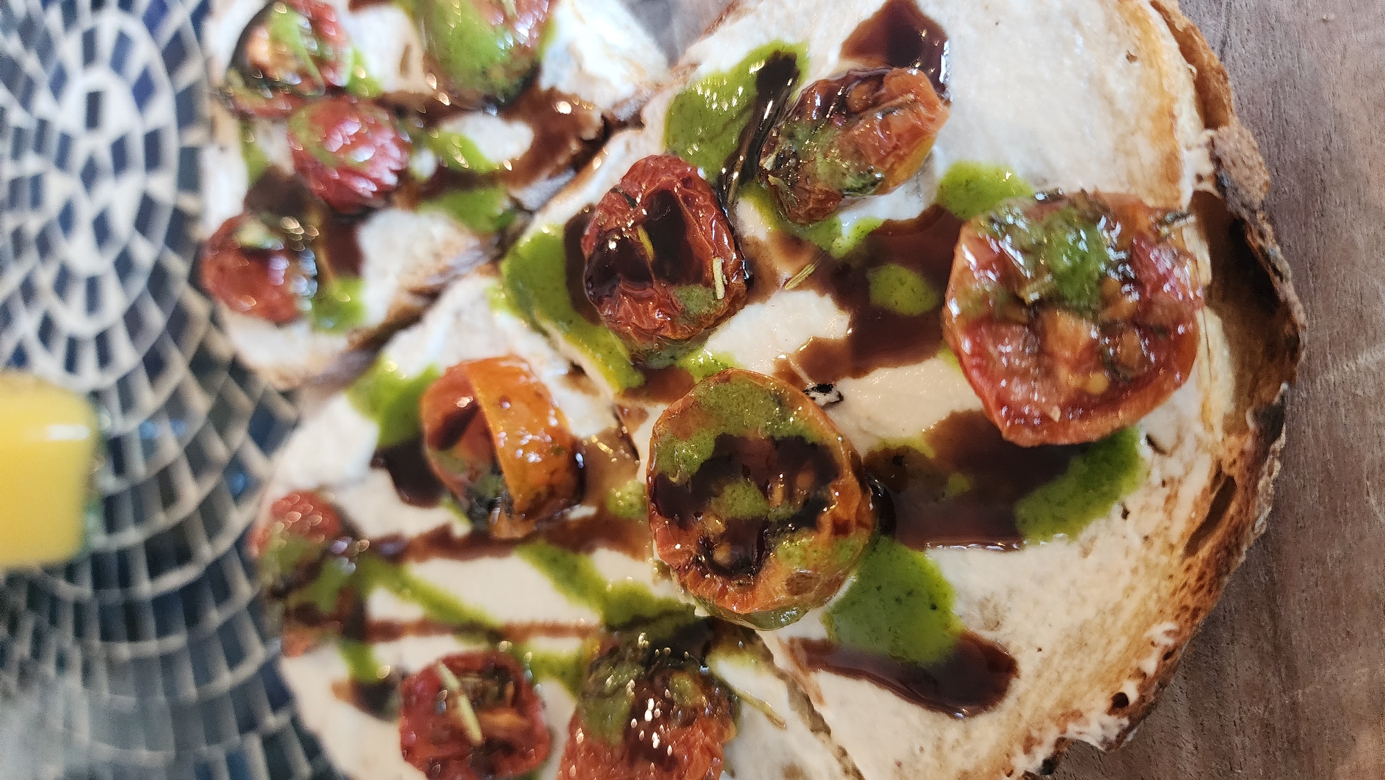 The image depicts a plate of bruschetta, featuring toasted bread topped with a white spread (likely ricotta or goat cheese), roasted tomatoes, green pesto, and balsamic glaze. The food is arranged on a mosaic patterned surface, with a wooden countertop partially visible. The scene is indoors in the city of Jackson, United States of America.