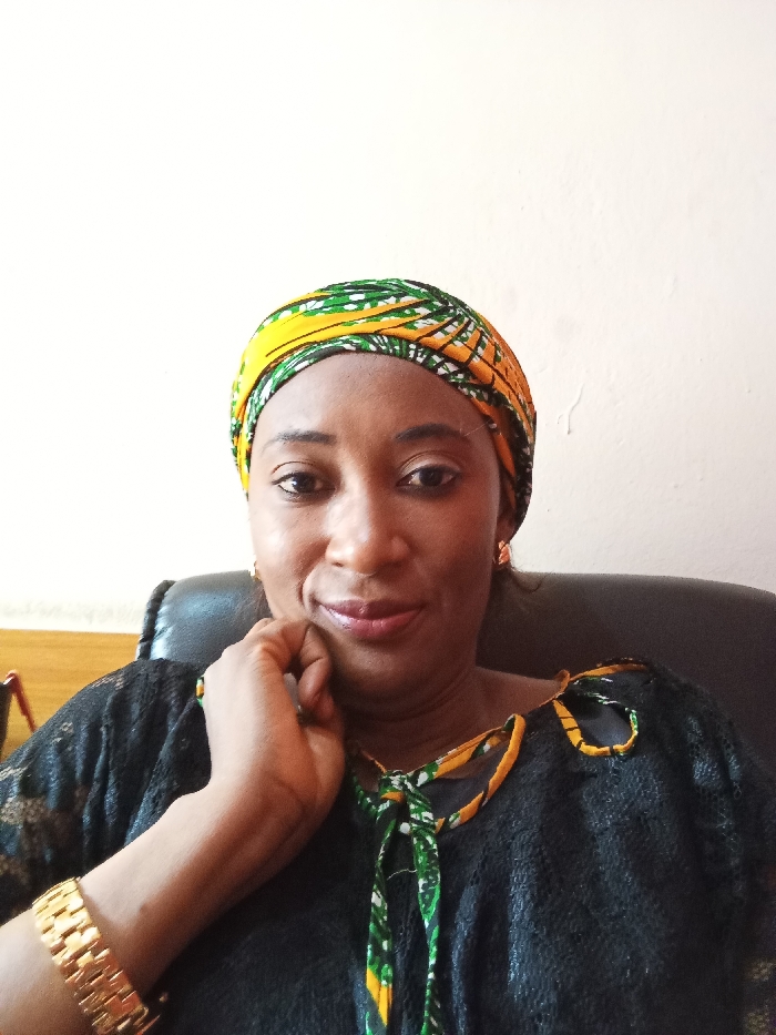 An adult female subject is depicted in a head-and-shoulders shot, seated and facing directly forward. She has dark skin and displays a subtle, closed-lip smile. Her head is covered by a patterned headwrap featuring a vibrant design in green, yellow, and orange. Small, gold-colored hoop earrings are visible on both ears. She is wearing a dark-colored top, possibly black, with a textured or lace-like material and a decorative tie at the neckline, utilizing fabric consistent with her headwrap's pattern. Her right hand is raised, with fingers gently curved, resting against her chin or jawline. A gold-colored, linked bracelet is visible on her right wrist. The subject is seated in what appears to be a dark, possibly leather-upholstered chair, parts of which are visible behind her. The background is a plain, light-colored wall, likely off-white or cream. The image contains no visual cues or discernible landmarks to indicate its location within the city of Kaduna, Nigeria, or any other specific geographic place.
