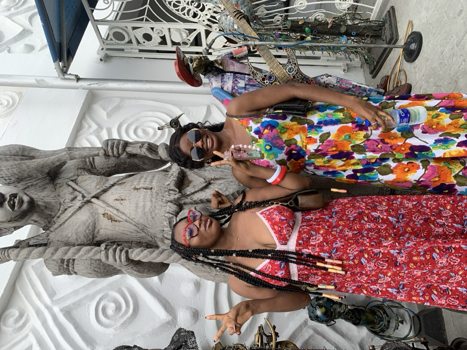 Two young adult females are depicted posing outdoors in Ikate, Nigeria, against a backdrop of various art installations