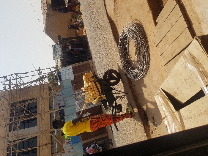 The image portrays an outdoor street scene in Jos, Nigeria, under clear, bright daylight. In the mid-ground, a dark-skinned male subject, wearing a yellow short-sleeved shirt, orange patterned trousers, and light-colored sandals, pushes a dark-colored wheelbarrow. The wheelbarrow's basin is filled with numerous light-colored, cylindrical bundles, consistent with peeled sugarcane sticks. To the immediate right of the wheelbarrow, on the ground, a large coil of metal wire is present. In the bottom right foreground, several wooden planks are arranged horizontally, next to a partial view of a light-colored object wrapped in clear plastic. The ground surface is a mixture of dirt and gravel, indicative of an unpaved or partially paved street. On the left side of the scene, a multi-story building is under construction or renovation, featuring extensive wooden scaffolding and dark-tinted windows. A temporary barrier constructed from corrugated metal sheeting is visible at its lower level. Across the unpaved road, in the background to the right, a smaller, single-story building constructed of earth or unplastered brick stands adjacent to an open-front stall. Two additional individuals are observed walking away in the distance on the right side of the road. Shadows are distinct, consistent with direct sunlight.